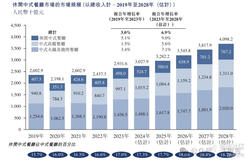 休闲中式餐厅市场的总收入由2019年的人民币4,075亿元增至2023年的人民币4,980亿元,复合年增长率为5.1%。展望未来,休闲中式餐厅总收入预期于2023年至2028年按9.0%的复合年增长率维持稳定增长,于2028年达人民币7,672亿元。