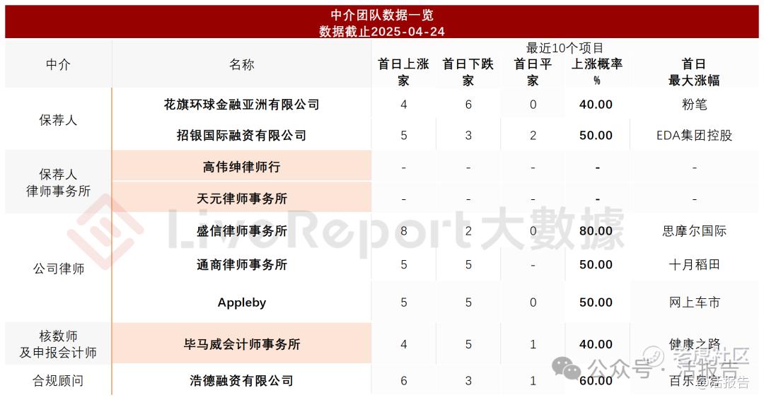 据LiveReport大数据统计,绿茶集团中介团队共9家,其中保荐人2家,近10家保荐项目数据平平无奇;公司律师共计3家,综合项目数据表现平淡。整体而言中介团队历史表现可圈可点。
