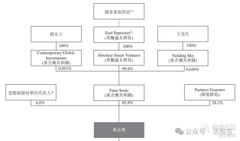 IPO前,Time Sonic拥有公司65.8%股权,控制人为王先生、路女士及其绿茶家族信托;受限制股份单位代名人(公司股权激励信托)持股6%。