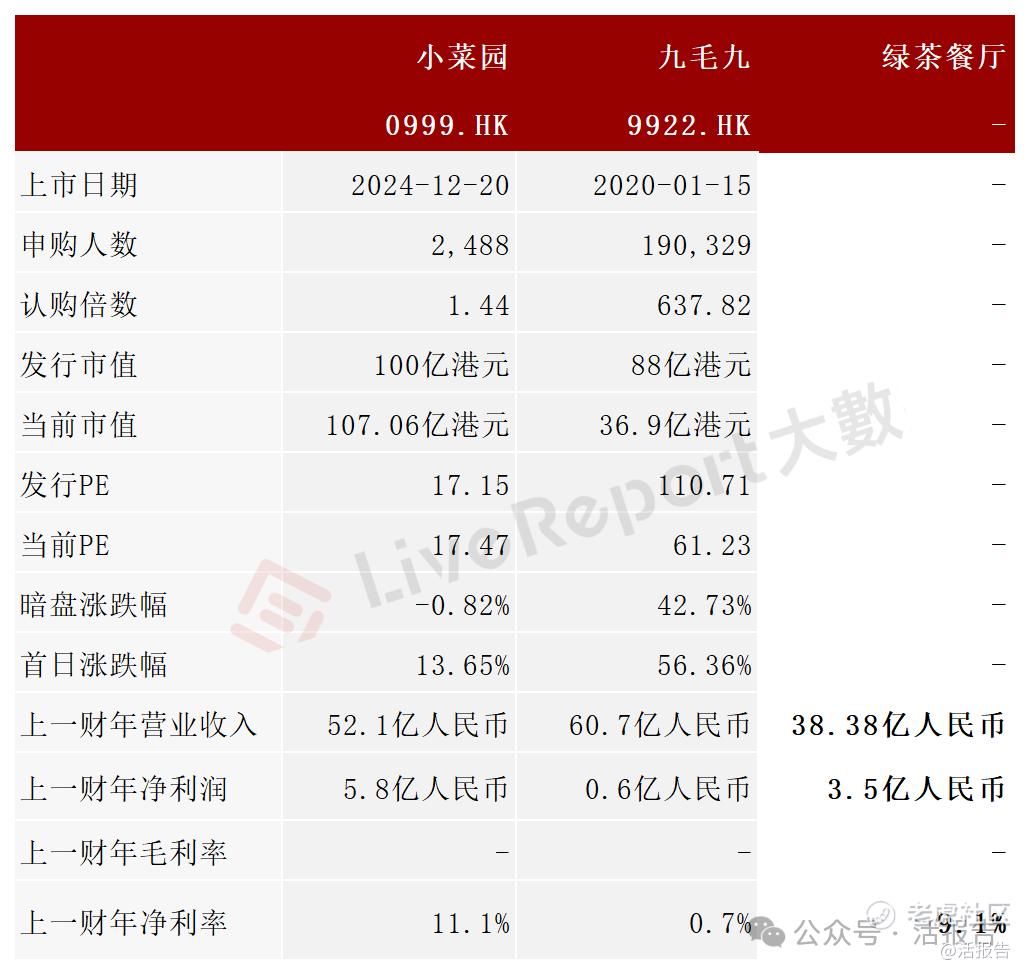 IPO同行业对比公司:小菜园(0999.HK)、九毛九(9922.HK)