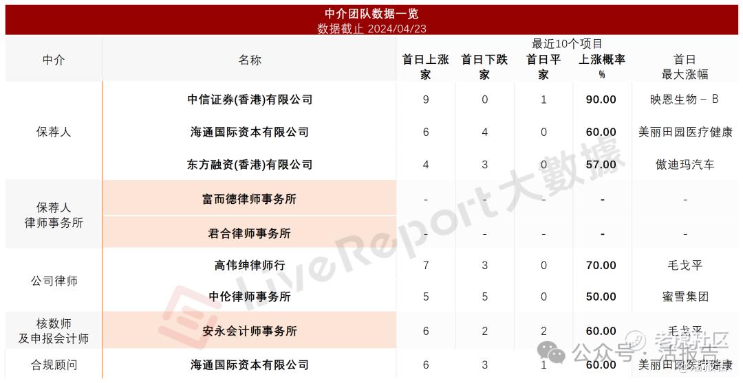 据LiveReport大数据统计,沪上阿姨中介团队共计8家,其中保荐人3家,近10家保荐项目数据表现良好;公司律师共计2家,综合项目数据表现尚可。整体而言中介团队历史数据表现较为理想 。
