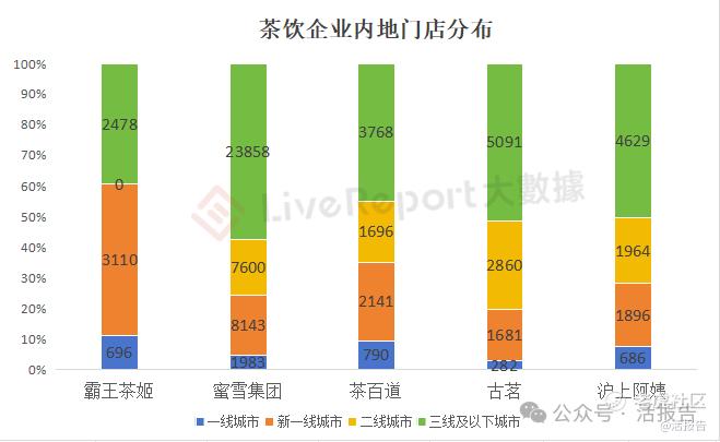对比其他四家茶饮企业,沪上阿姨门店总数位居第三,其主攻下沉市场,50.5%的门店是在三线及以下城市,与蜜雪(57.4%)、古茗(51.4%)相似,三家在下沉市场占比均超过50%。