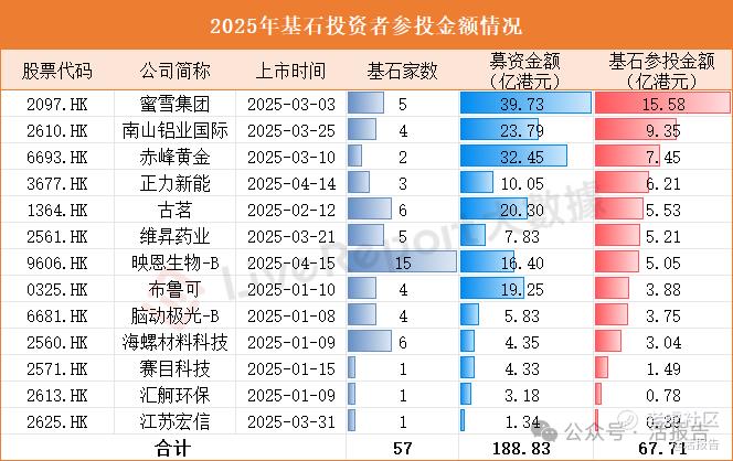 按参投金额计,前三的公司分别为蜜雪集团、南山铝业及赤峰黄金,参投金额分别为15.58亿、9.35亿及7.45亿港元。
