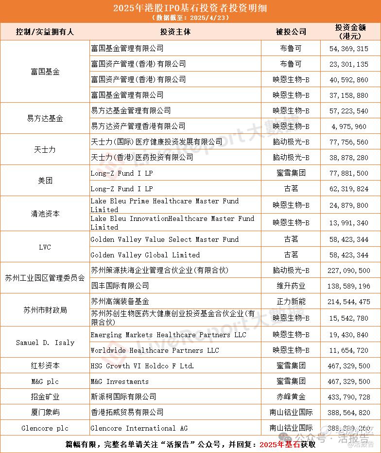就基石投资者的单笔投资而言,红杉资本、M&G plc及招金矿业单笔投资均超过4亿港元,分别投资的蜜雪集团及赤峰黄金。