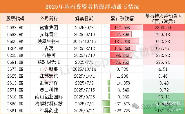 浮动收益方面,截至2025年4月23日港股收盘,当前基石投资者持股浮动盈利前三的公司分别为蜜雪集团、赤峰黄金及映恩生物-B,分别累计浮动盈利金额约23.0亿、7.29亿及6.62亿港元;