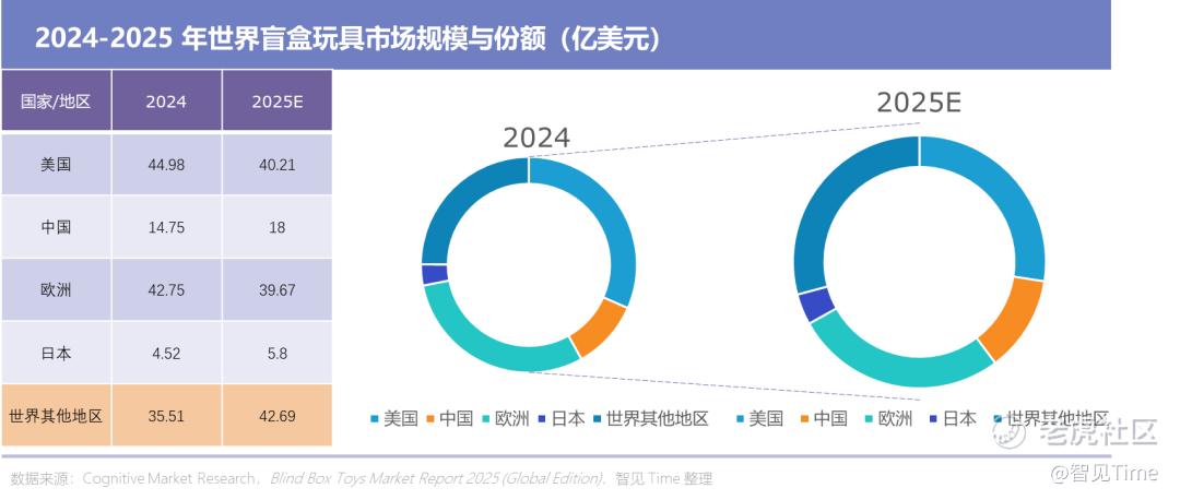 有趣的是,受到经济不景气、通胀未能完全解决、关税等诸多原因,美国的盲盒玩具市场规模预计从 2024 年的 44.98 亿美元下滑至 40.21 亿美元,萎缩近 10%。