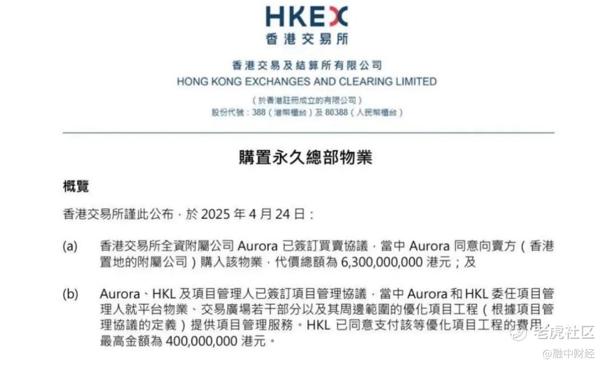4月24日,“港交所”公布消息称,耗资63亿港元,向香港置地购入“中环交易广场”一期相关物业,作为集团总部及办公室。过去40年港交所一直在中环交易广场租赁办公楼层。此次是由其全资附属公司Aurora出面,包括交易广场一期(第一座)第42楼至50楼连平台物业,实用面积总14.7万平方呎。