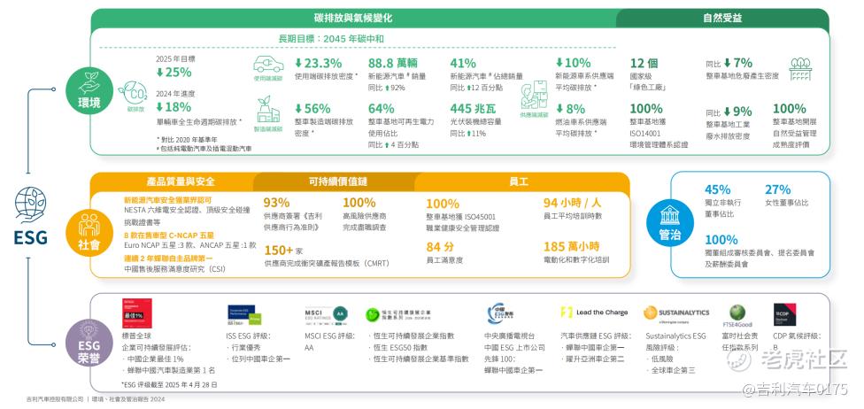 4月28日,吉利汽车控股有限公司(0175.HK,以下简称“吉利汽车”)发布了2024年环境、社会及管治(ESG)报告。报告系统性披露了,吉利汽车2024年深度践行ESG战略六大方向的突出表现和显著成果,通过能源“再生”、产品“节能”、材料“循环”、技术“创新”等多元化举措协同减排,实现了2024年单辆车生命周期碳排放较2020年基准年下降18%,新能源销量同比增长92%、达88.8万辆,并拥有12个绿色工厂和11个无废工厂,成为唯一入选全国首批“无废企业”的车企,荣获国内外多个权威机构ESG优秀评级。2025年是“智能吉利2025”战略的收官之年,吉利汽车将稳步推进气候中和、自然受益、全域安全、数智创新、共荣发展、治理与道德的六大战略方向切实落地,全力实现单车全生命周期碳减排25%以上的目标。