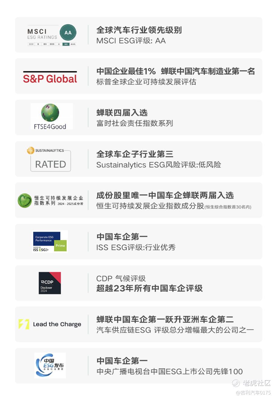 凭借ESG管理工作的推进落地、全面详尽的ESG信息和战略披露、和利益相关方的充分交流探讨,吉利汽车2024年ESG相关工作赢得外界的广泛赞誉和权威认可,包括连续三年荣获《财经》双碳领导力“卓越”评级,连续两年位居“中国ESG上市公司先锋100”榜单第八、蝉联中国车企第一名,还获得国际最具权威性的MSCI ESG评级AA级,且连续两年入选恒生可持续发展企业指数,ISS ESG评级行业优秀、中国车企第一等荣誉,充分印证了吉利汽车的中国车企ESG标杆地位。