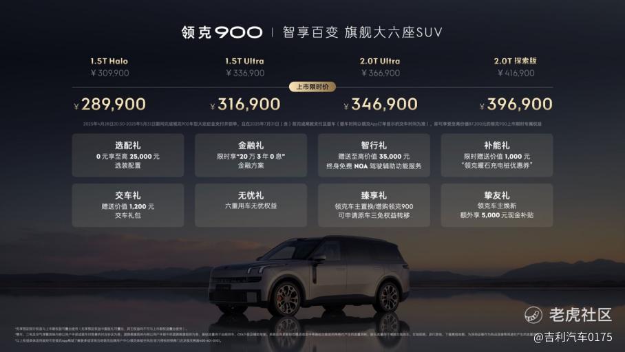 2025年4月28日,领克汽车旗下全新旗舰力作领克900正式上市,推出1.5T Halo、1.5T Ultra、2.0T Ultra 、2.0T探索版四大配置,限时售价28.99万元至39.69万元。