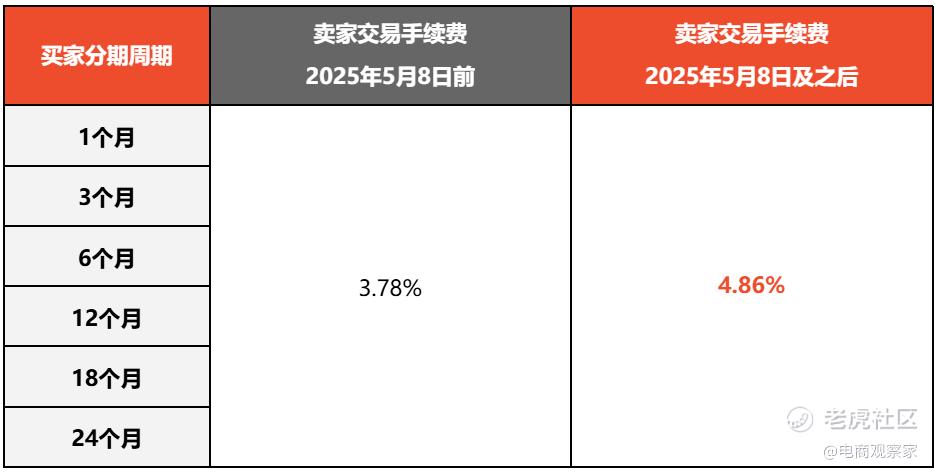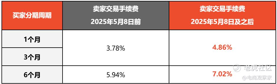 专项买家分期付款(SSPayLater)方面,卖家交易手续费率3个月内从3.78%提升至4.86%,6个月后将从5.94%提升至7.02%。