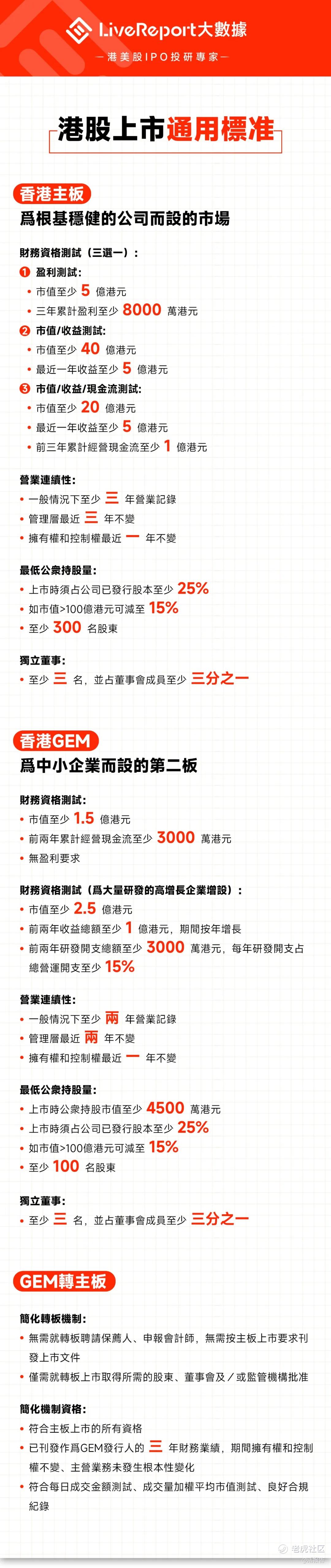 那么,企业想去港股上市,需要满足什么条件?LiveReport整理了港股通用上市标准:
