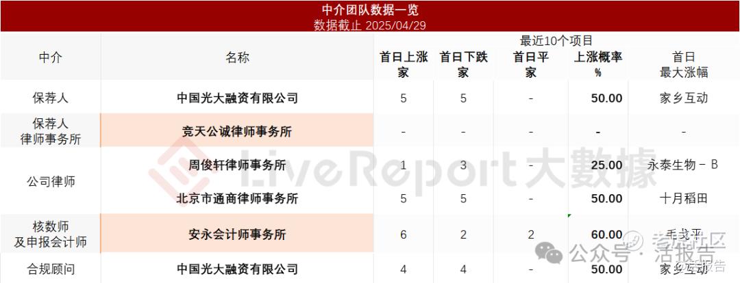 据LiveReport大数据统计,果下科技中介团队共计6家,其中保荐人1家,近10家保荐项目数据表现一般;公司律师共计2家,综合项目数据不尽如意。整体而言中介团队历史数据表现有待进步。