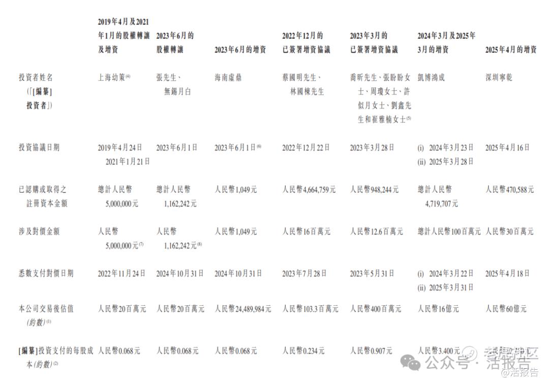 公司进行过七次融资或转让行为,最近一次融资时间为2025年4月,此轮投后估值约60亿人民币,每股成本12.75人民币。