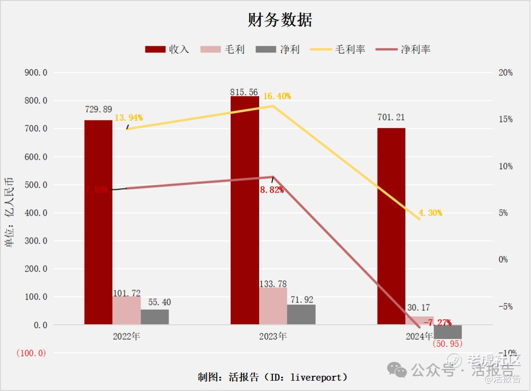 2022-2024年公司收入呈现波动:2022年729.89亿,2023年上涨至815.56亿后,2024年大幅下跌至701.21亿。盈利指标显著恶化:毛利率先升后跌,净利率由正转负,2024年暴跌至-7.27%,净利从2022年盈利55.40亿转为2024年亏损50.95亿,表明成本费用失控或存在重大资产减值等风险。