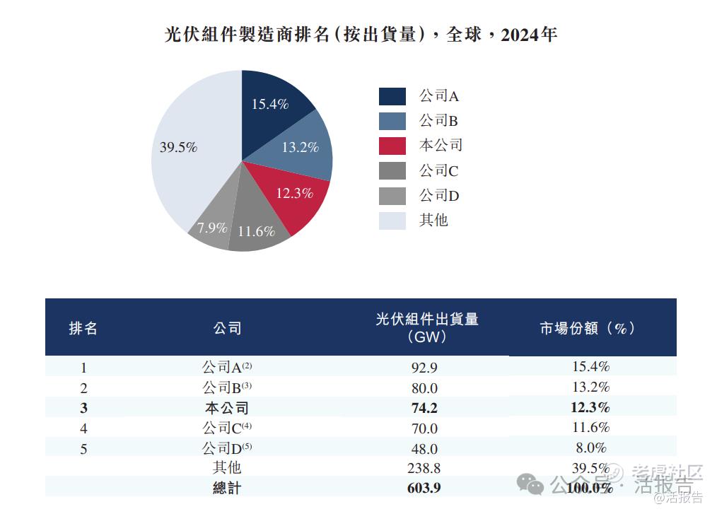 根据弗若斯特沙利文的资料,按照2024年光伏组件出货量,公司以74.2GW的光伏组件出货量在全球排名第三,占全球总市场份额的12.3%。前五家企业合计持有60.5%的市场份额。