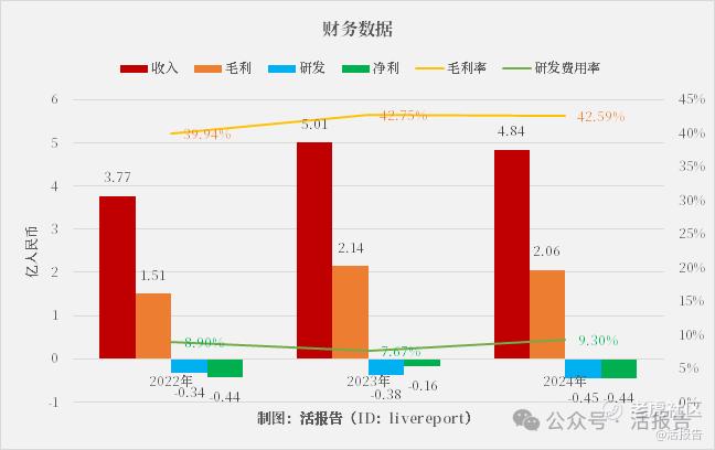 公司收入、毛利于2023年都有较好增长,但2024年小幅下降,毛利率稳定在40%以上,研发费用率有所提高,与净亏损大致持平。