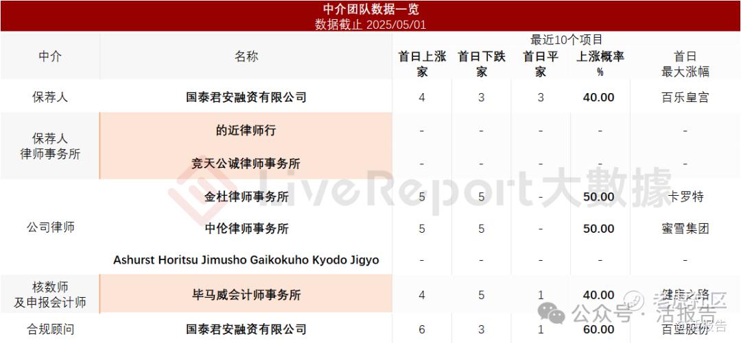 据LiveReport大数据统计,普爱医疗中介团队共计8家,其中保荐人1家,近10家保荐项目数据表现不足;公司律师共计3家,综合项目数据有待进步。整体而言中介团队历史数据表现无特别之处。