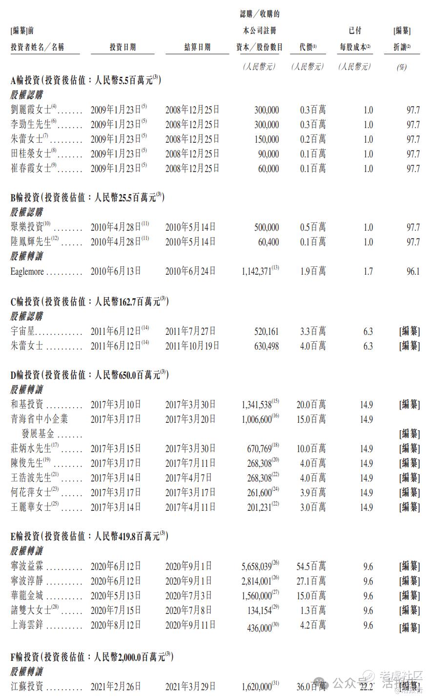 公司上市前经历了多轮融资。在2021年2月的F轮投资中,公司的投后估值约为20亿元人民币,每股成本约为22.2元。