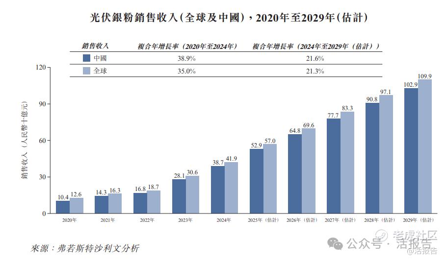 根据弗若斯特沙利文报告显示,全球光伏银粉的销售收入由2020年的人民币126亿元增至2024年的人民币419亿元,复合年增长率为35.0%。同期,中国光伏银粉的销售收入由2020年的人民币104亿元增至2024年的人民币387亿元,复合年增长率为38.9%。