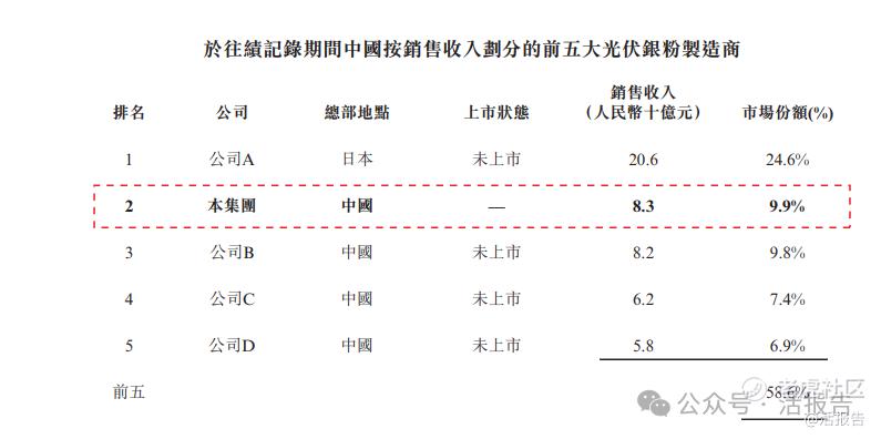 公司是中国研究、开发、生产及销售银粉的先行者及引领者。公司的银粉产品主要用于光伏银浆(生产光伏电池的关键原材料)的生产。于往绩记录期间,公司的主要优势之一在于公司生产高端银粉的能力,该等银粉最终用于生产更新型的光伏电池或其零部件,包括PERC电池及TOPCon电池的正面细栅以及HJT电池及xBC电池的导电栅。根据弗若斯特沙利文的资料,按中国光伏银粉销售收入计,于往绩记录期间,公司在所有国内生产商中排名第一,在所有全球生产商中排名第二,市场份额为9.9%。