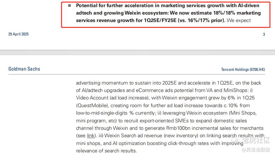 根据高盛报告,腾讯借助AI驱动的广告技术和微信生态,腾讯的广告服务收入有望进一步加速。上调一季度和今年全年的广告服务收入增长分别为18%/18%,之前预测是一季度增长16%,全年增长17%。
