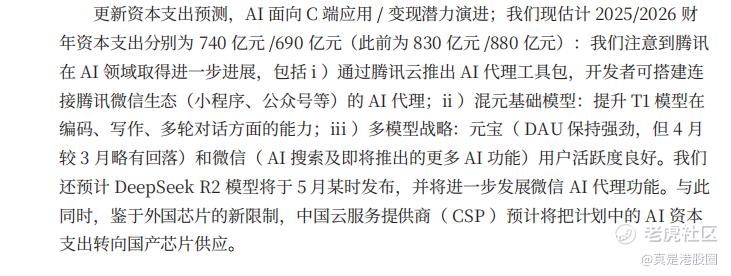 例如,腾讯云推出AI工具包,开发者可以搭建链接腾讯微信生态的AI代理;微信/QQ加入了元宝,并且QQ与微信能够互通;游戏业务上,AI也提升了游戏制作的效率等。