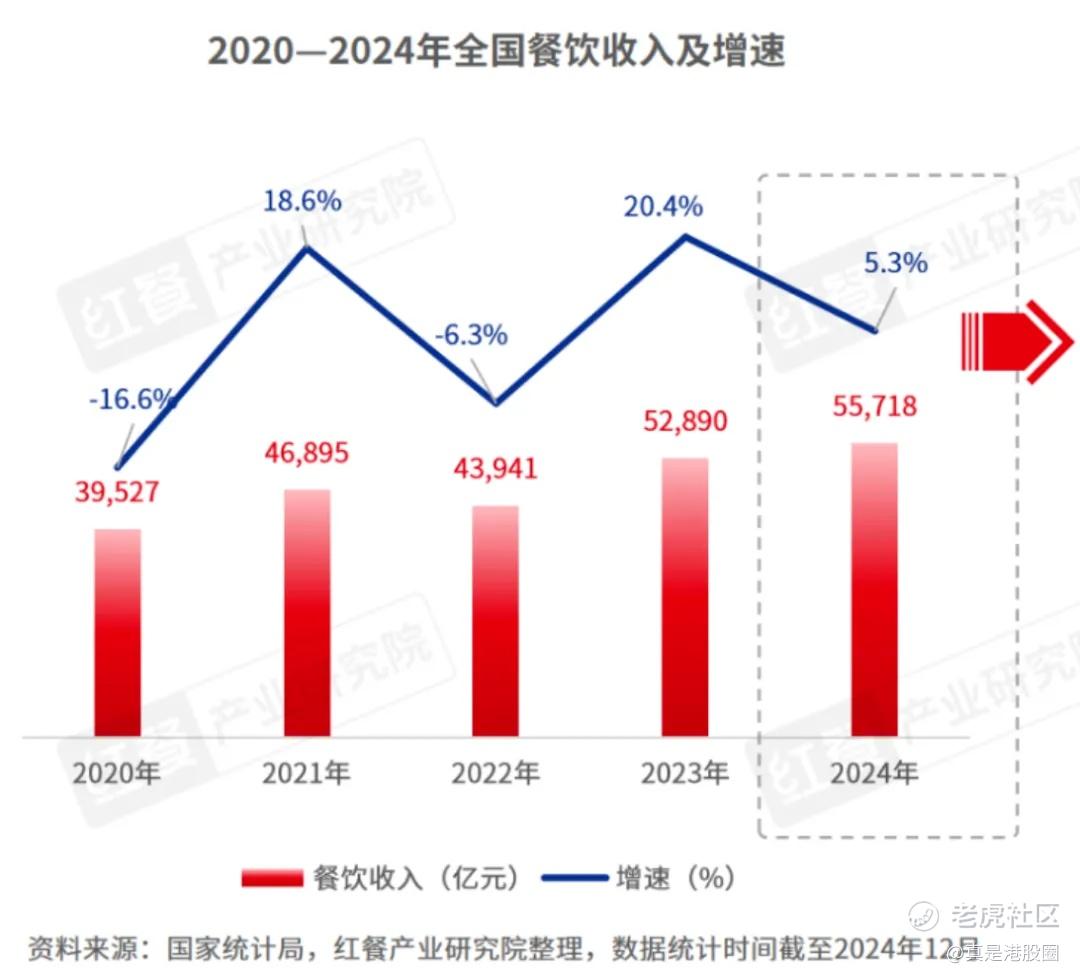 餐饮行业,往往把餐和饮合并在一起,而从行业数据来看,餐饮市场大盘2024年增速约为5.3%,但不幸的是现制茶饮的增速达到了20%,不难推断,餐食的市场规模是负增长的。