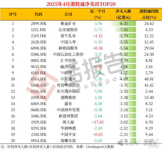 港股通净卖出最多的个股包括紫金矿业、比亚迪股份、蒙牛乳业等,其中紫金矿业被卖出约8.35亿港元,比亚迪股份被卖出超7亿港元。