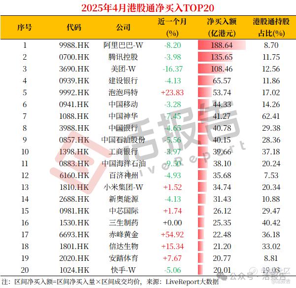 4月份港股通净买入最多的包括阿里巴巴、腾讯控股、美团、泡泡玛特等明星公司,其中阿里、腾讯、美团等科技巨头获北水持续买入,月度净买入额均超过百亿,热门潮玩股泡泡玛特也在超靓业绩下获得了超50亿的净买入。
