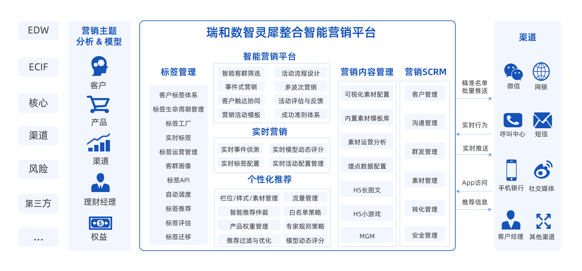 瑞和数智推出的“灵犀”智能营销中台以客户需求为导向,融合AI技术与金融业务流程,通过数字化改造构建六大核心模块(智能营销平台、实时营销平台、个性化推荐系统、客户标签管理系统、客户画像系统、营销内容管理系统),助力银行实现营销全流程智能化,强化多渠道协同能力,提升数字化运营效能