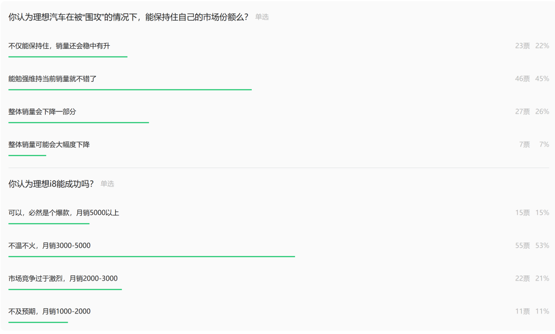 一共两个问题,第一个问题是理想能否在友商的“围攻”下保住市场份额,大多数人的预期是理想销量能够保住市场份额,但也很难有更大的突破;第二个问题是关于理想i8的销量,这里非常有意思的是大多数人认为月销可以做到3000-5000台/月。