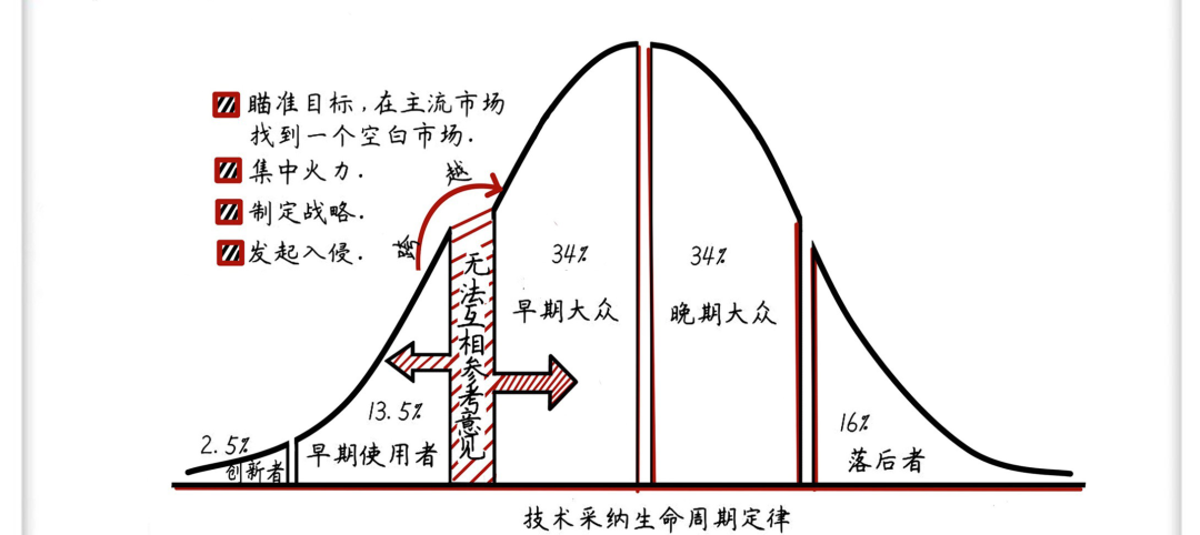 因为按照“跨越鸿沟”中的理论,一种新技术或者产品向市场投放后,一般会经历5个阶段的“使用群体成分变化”,分别是:创新者、早期使用者、早期大众、晚期大众、落后者。