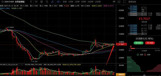 我们还是从EOS上来看一下现在的情况,我们从EOS的日K线图来看,目前30日均线和180日均线马上就要粘合在一起了,这也意味着EOS马上就要选择方向了,而且我们看,EOS在30日均线上的反弹力度,是逐渐减弱的,截至到这两天,基本上已经没有反弹了,所以接下来就是选择方向的时候,而且方向的选择不是在今天就是在明天!如果一旦选择向上,30日均线向上穿过半年线形成金叉,那么EOS将是一波非常大的涨幅!而且必定是会超过前高4.4美元的位置的!