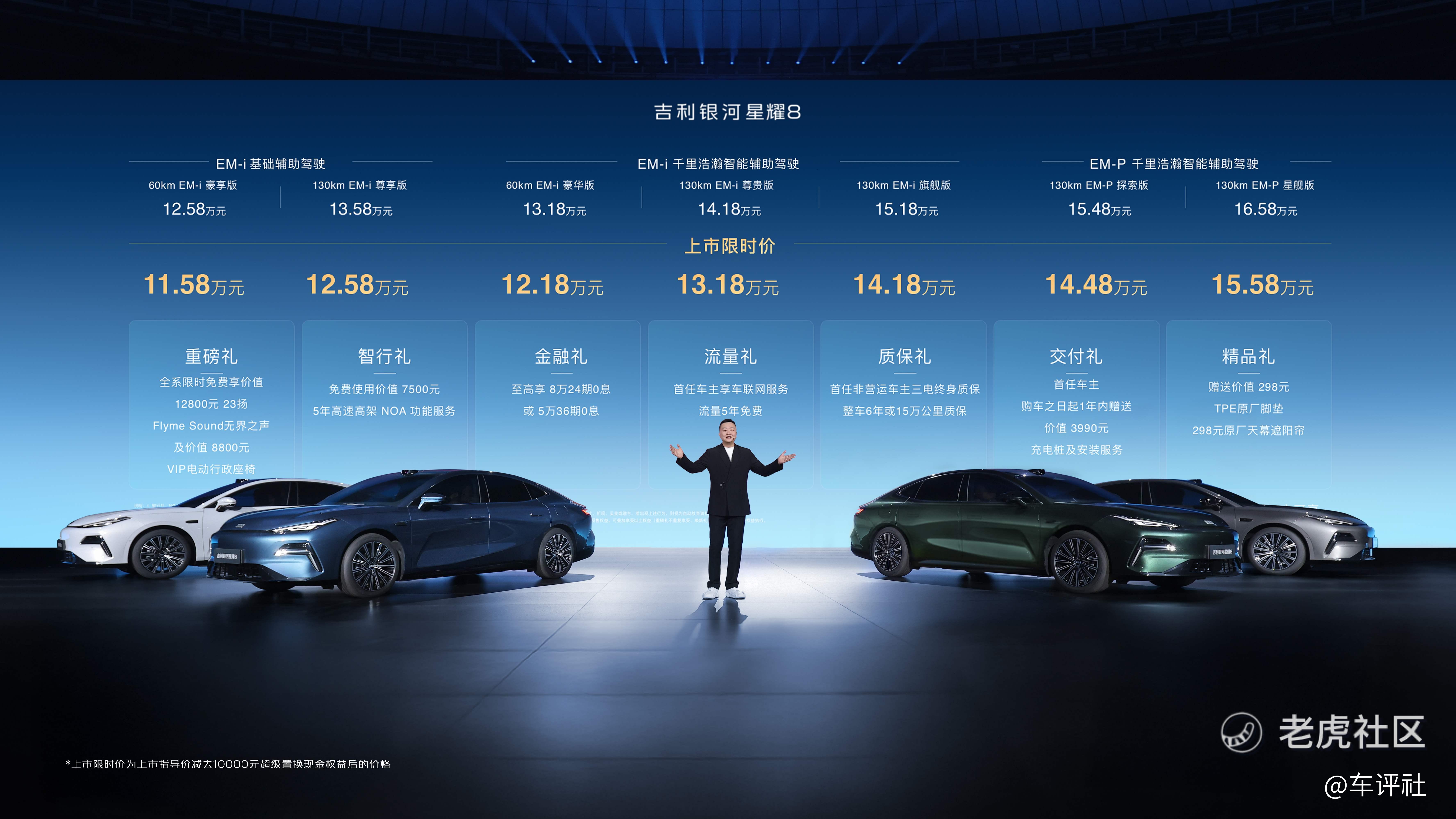 5月9日,全球新一代豪华中高级电混轿车——吉利银河星耀8正式上市。新车推出极致性能雷神EM-P 2个版型、极致节能雷神EM-i 3个版型,该5个版型标配千里浩瀚智能安全辅助驾驶;同时为满足用户对辅助智驾的自由选择需求,推出雷神EM-i 2个版型标配基础辅助驾驶。吉利银河星耀8上市限时价11.58~15.58万元(仅限2025年6月30日前,完成大定锁单的用户,可享上市限时价),同时也为用户推出丰厚的限时购车权益。