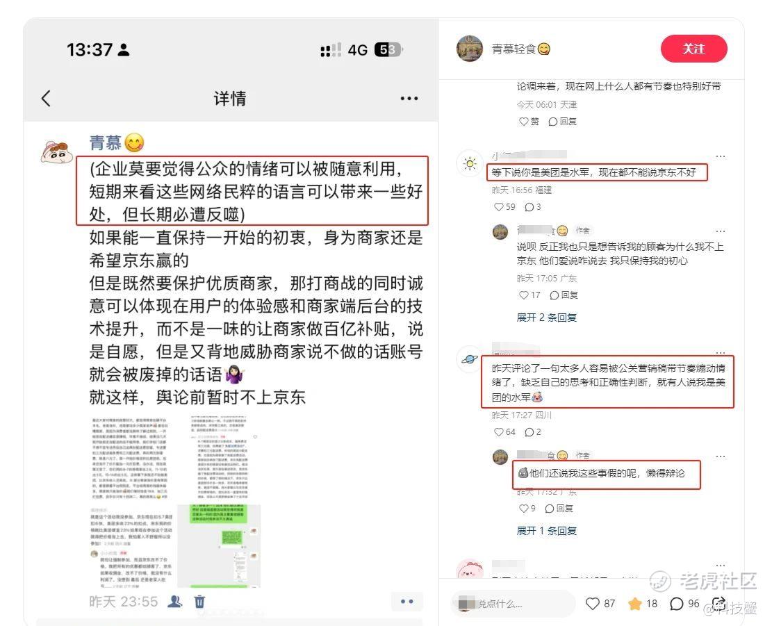 遗憾的是,最近京东评论区,也被浑水摸鱼的人占领了,逐渐变成“自我感动大会”和“东哥语录集锦”,批评意见迅速被稀释或封禁:有人质疑物流体验下降,就被指责“带节奏”,有人吐槽购物体验变差,就是“别有用心”,有人提建议改进接单流程,也被质问“你配吗”?——饭圈铁桶阵阻碍了消费者、商户、骑手真实意见的表达。很显然,这不是商业的进步,而是组织的封闭。