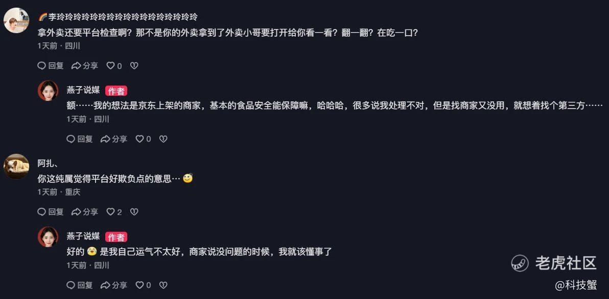 甚至一般路人,不管是提意见还是反馈问题,都一样要遭遇东哥“真爱粉”的无情冲击。有消费者在自己账号里发视频抱怨,点京东外卖吃到霉菌,要找客服理论。本以为同为消费者,大家都能理解他,给他支招。谁知评论区竟有一股为平台伸冤的势力:商家不老实,你找平台干什么?说得好,食品安全、假货山寨,都是行业共性问题,是小老板太贪了。但为什么偏偏只有你东哥,打出了品质堂食的口号呢?