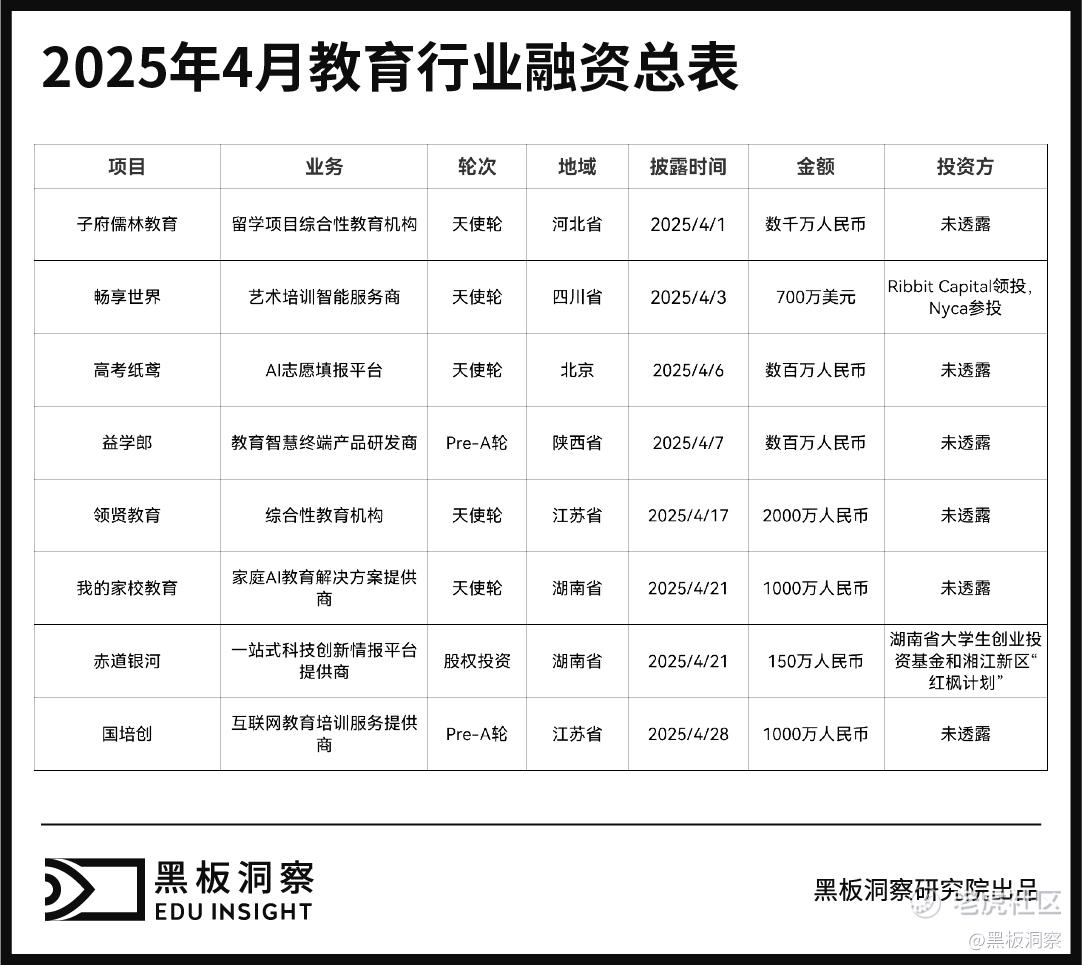 2025年4月教育行业共发生8起融资事件,融资总金额约为1.195亿人民币,分别为:国培创(苏州)教育科技有限公司完成千万元Pre-A轮融资。本轮融资将用于AI核心技术研发、海外市场拓展及人才团队建设。赤道银河日前获得到了湖南省大学生创业投资基金和湘江新区“红枫计划”共计150万元的投资。湖南省我的家校教育科技有限公司完成1000万天使轮融资,该轮融资由知名投资机构独家领投。本轮融资将用于深化业务拓展,优化AI软件研发与培训课程,扩大无人机培训规模。同时加速市场布局,强化分公司运营,推动我的家校AI生态平台完善,促进产学研融合。江苏领贤教育咨询有限公司完成2000万天使轮融资。融资资金将用于线上平台的搭建、线下业务的拓展,以及人才招募等方面。国内AI教育科技企业益学郎科技(西安)有限公司宣布完成数百万Pre-A轮融资,本轮融资由教育科技领域专业投资机构领投,资金将主要用于AI大模型研发、技术团队扩充及内容生态建设。“高考纸鸢”宣布完成数百万元天使轮融资,投资方暂未披露。本轮融资资金将用于产品研发、市场拓展和组织运营。四川畅享世界科技有限公司成功完成700万美元的天使轮融资,由Ribbit Capital领投,Nyca参投,此次天使轮融资将用于进一步优化产品功能,扩大线下乐球舱规模,以及市场营销推广等方面。“子府儒林教育”完成数千万天使轮融资,此次融资由国内三家机构联合投资。“子府儒林教育”是一家专注于线上、线下教育及留学项目的综合性教育机构,此轮融资将用于线上平台的搭建、线下业务的拓展,以及人才招募等方面。