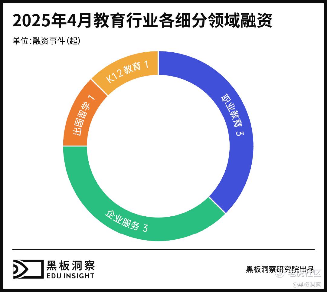4月细分领域的融资事件中,企业服务3起、职业教育3起,出国留学、K12教育各1起。