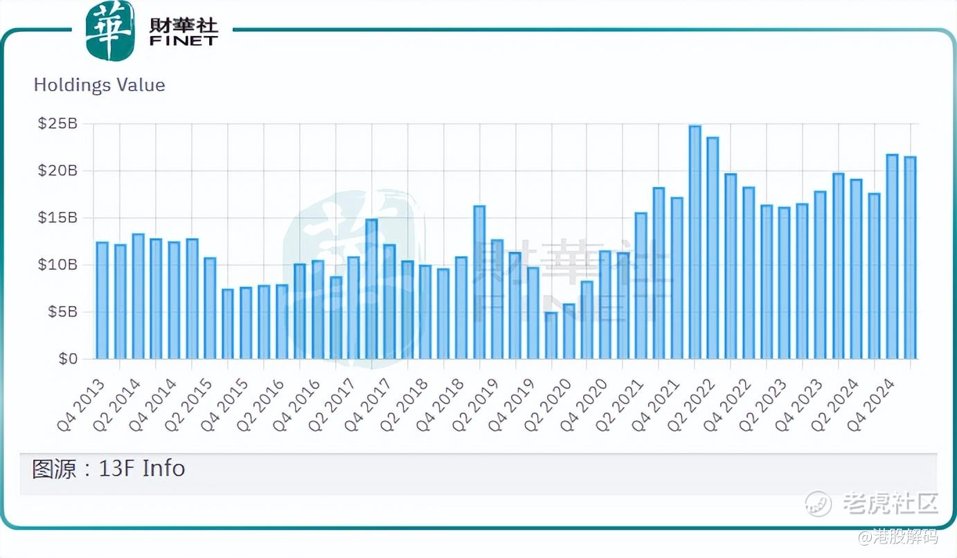 数据显示,2025年一季度末,桥水基金的美股多头持仓金额为216亿美元,几乎持平上季末的218亿美元,近年仓位一直处于较高水平,如下图所示。