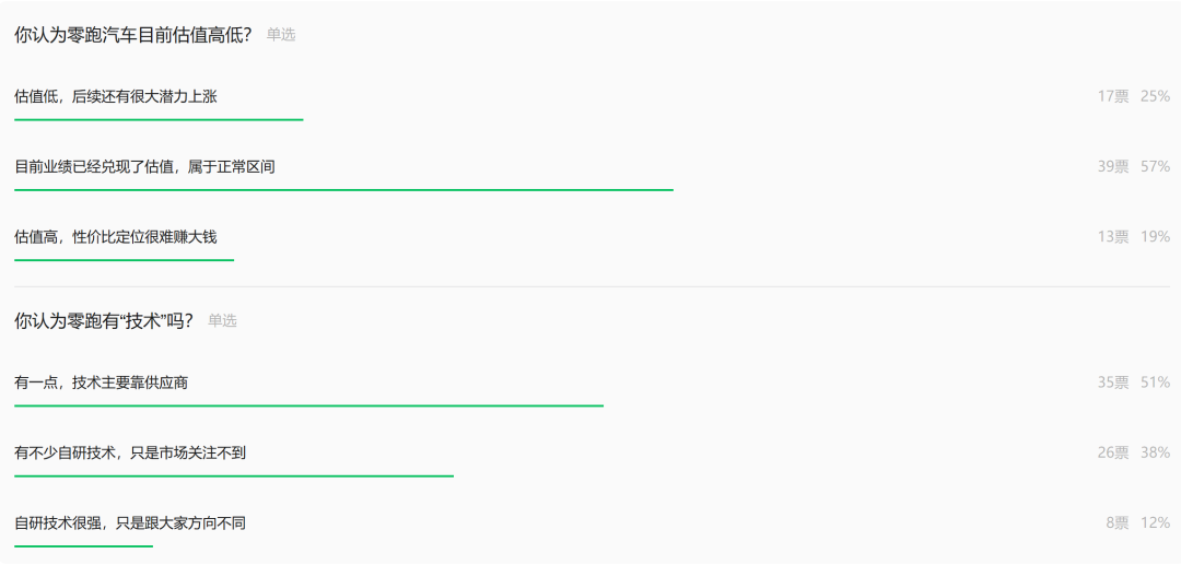 一共两个问题,问的都比较直接,在估值方面,大多数人认为零跑目前处于估值正常的区间,可买可不买;在技术方面,大多数人都不太看好零跑的技术,这一点说明朱江明是时候出来多讲讲了。