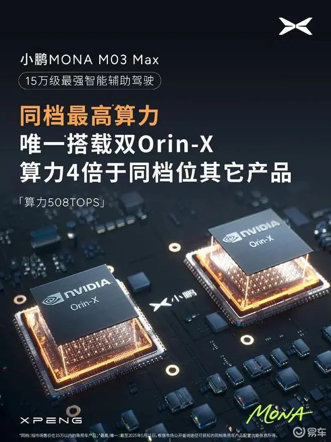 首先是近期交付的MONA 03 MAX版本——这是唯一在15万级别里搭配双Orin X芯片的车型(零跑选择了激光雷达+单Orin),能搭配双Orin也是因为节省了激光雷达的BOM成本,以及这台车定价也比零跑高出一些。