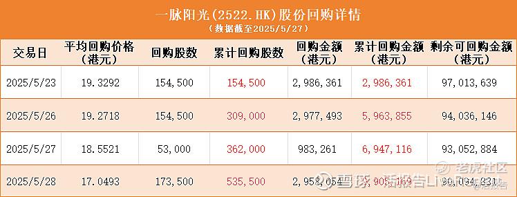 据最新披露显示,截至5月28日,一脉阳光已累计回购53.55万股,累计回购金额约990.52万港元,剩余可用回购资金约9009.48万港元。