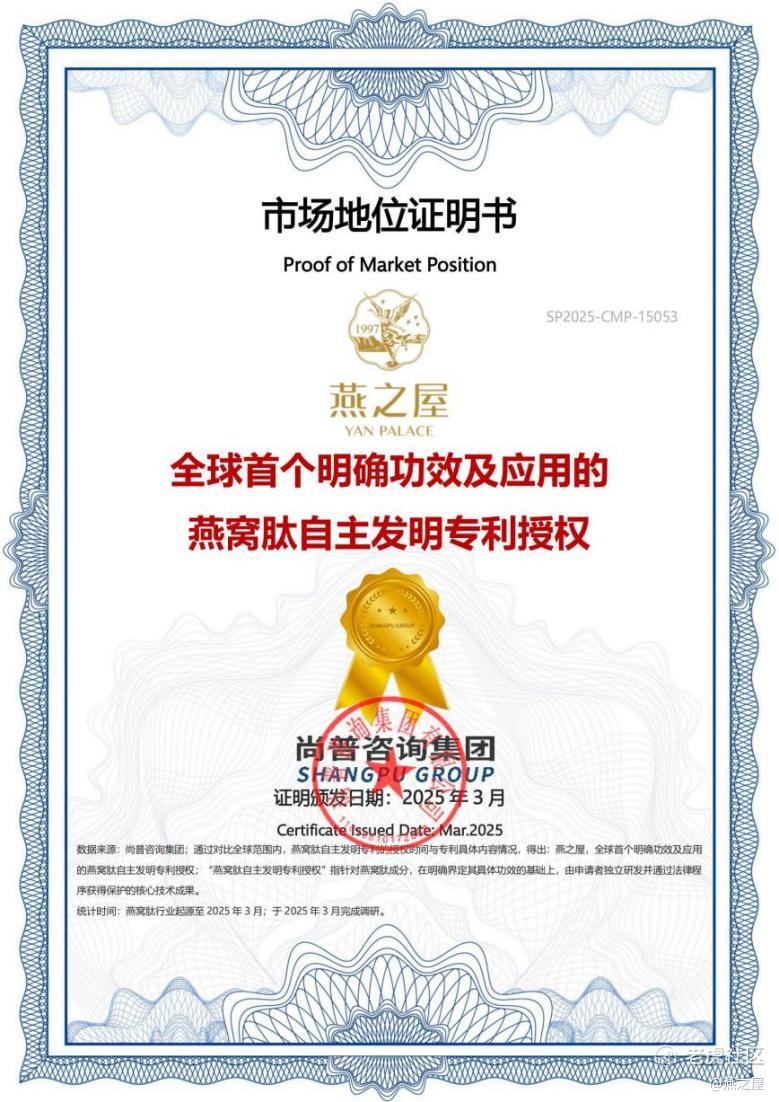 图:燕之屋获得“全球首个明确功效及应用的燕窝肽自主发明专利授权”认证