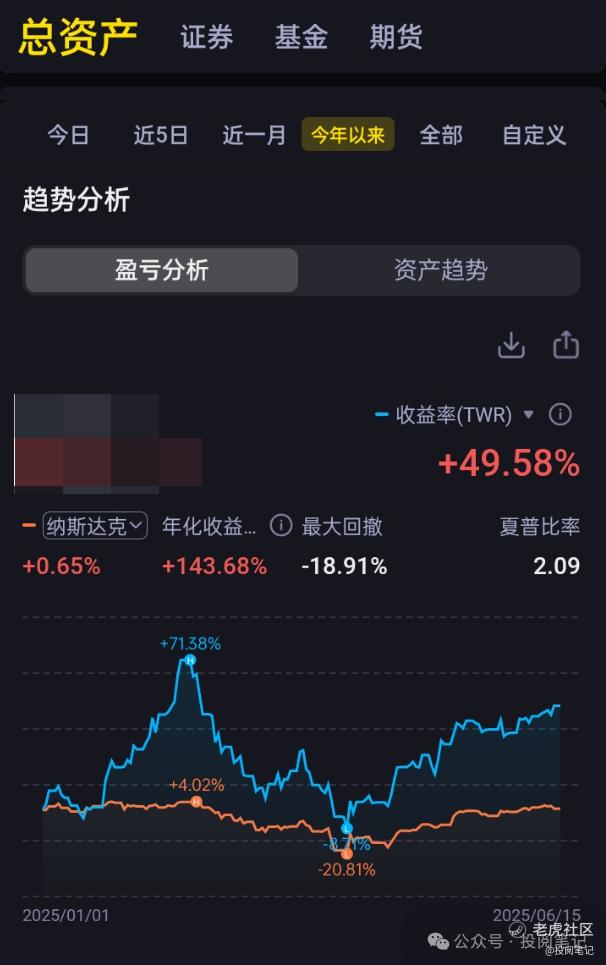 如上图所示,目前账户总收益来到了+858.07%,收益率相比上次继续上升;上次是++779.19%,这是总的账户收益率,接下来看下今年以来的收益率,如下图所示,今年以来的收益率为+49.58%(上次是+37.26%),期间纳斯达克+0.65%,相对收益+50.23%。