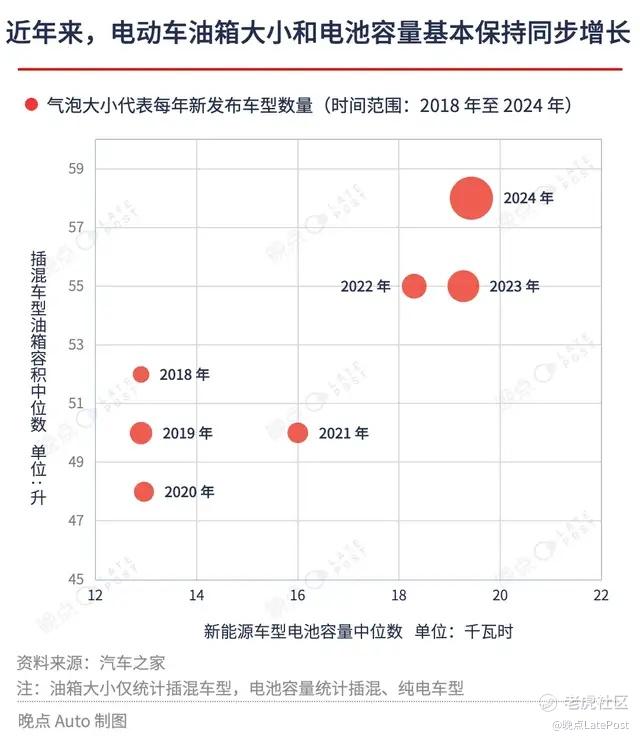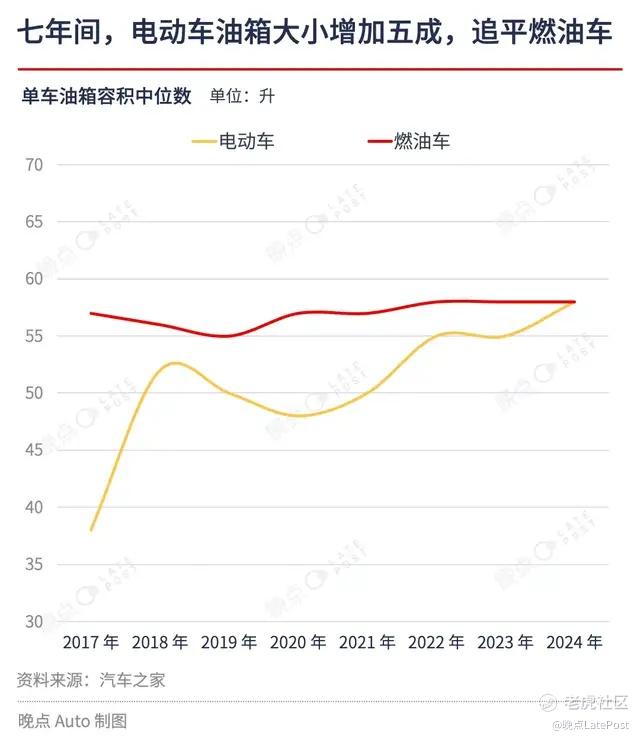 总的来看,从 2017 年到 2024 年,包括插混和增程车型在内,中国市场每年新发布的新能源车型油箱容积累计增加 52.6%、至 58 升,已基本与燃油车持平。