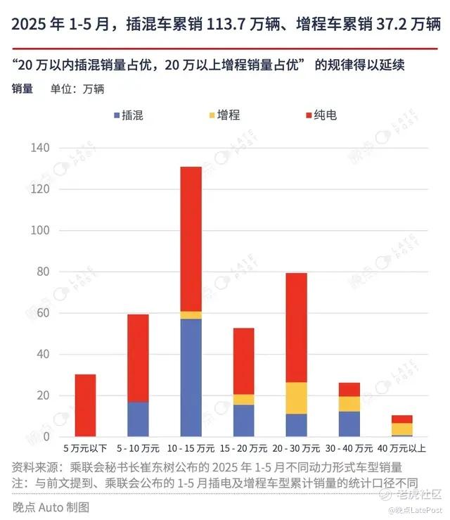经过多年技术迭代与市场竞争,增程、插混两种动力形式车型的优势价格区间也逐渐清晰。乘联会数据显示,插混车型在 10 万至 20 万元价格区间比增程车型市场份额更大,而在 20 万元以上价格区间,增程车型比插混车型更有机会实现销量爆发。