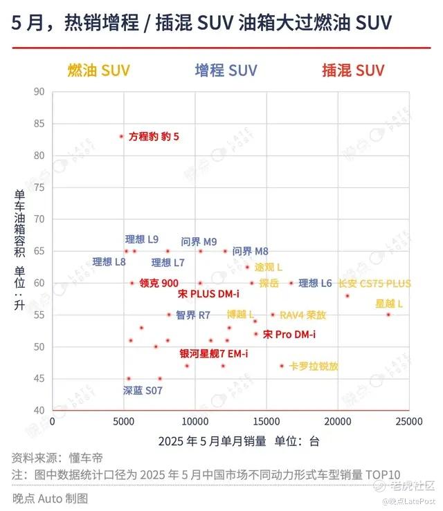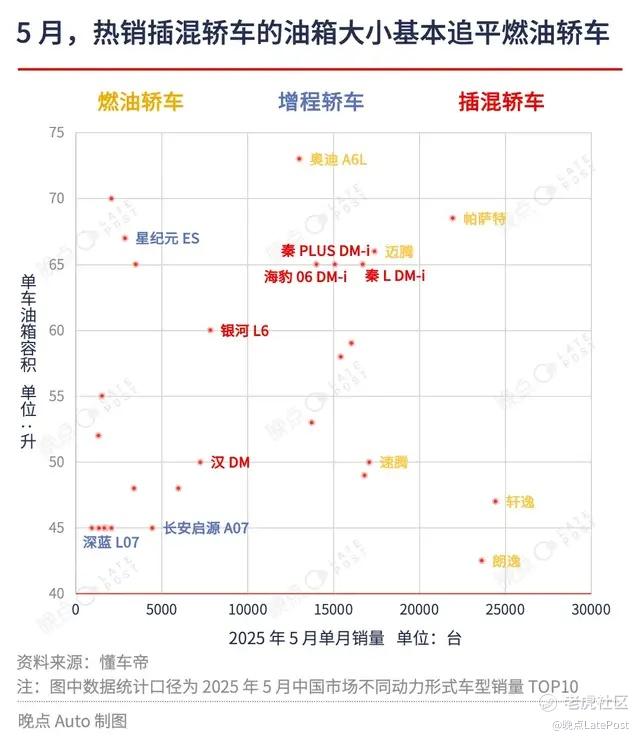 这已经成为汽车市场的普遍现象。我们统计懂车帝数据发现:在今年 5 月销量排名前十的不同动力形式车型中,比亚迪海豹 06 DM-i、秦 L DM-i 等插混轿车的油箱大小已经明显大于轩逸、朗逸、速腾等传统燃油轿车,与迈腾、帕萨特等车型基本持平;而问界 M9、理想 L7 等插混 SUV 的油箱已经大于星越 L、卡罗拉锐放、途观 L 等燃油 SUV。