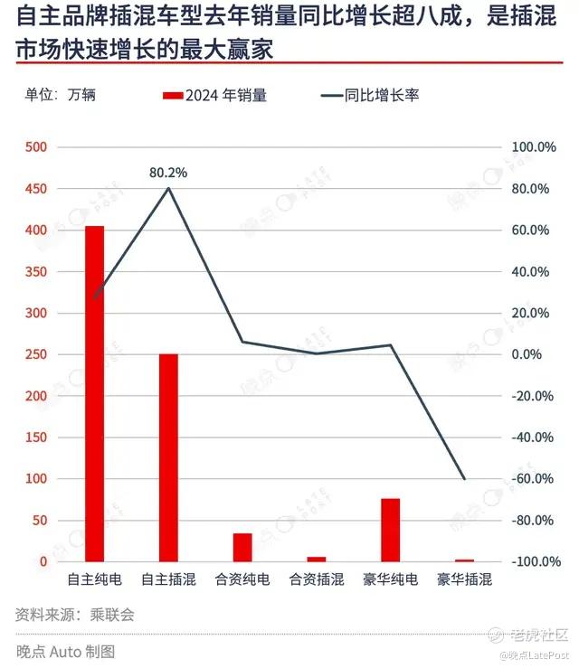 自主品牌是中国插混车型市场快速增长的最大赢家。乘联会数据显示,2024 年,自主品牌插混车型累计销售约 250.4 万辆、同比增幅达 80.2%。比亚迪 2024 年插混乘用车累计销售 248.5 万辆,是 2021 年的 9.1 倍。