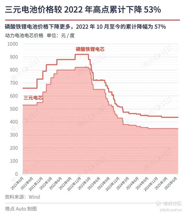 动力电池价格持续下降,为车企装载更大电池提供了 BOM 成本(Bill of Materials cost, 物料成本)空间。当前,碳酸锂的价格仅约 6 万元 / 吨,已不足 2022 年底碳酸锂价格高点的九分之一。无论磷酸铁锂电池还是三元电池,自 2022 年 10 月以来的价格累计降幅均超过 50%。